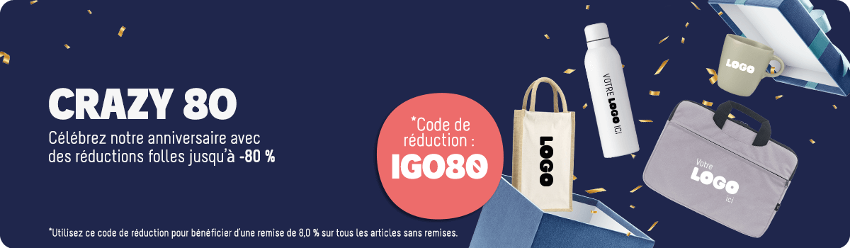 Depuis 80 ans, nous aidons les entreprises et les organisations à mettre en valeur leurs marques grâce à des objets publicitaires personnalisés. Pour célébrer notre anniversaire, nous vous offrons des remises spéciales Crazy 80 jusqu'à -80%. Nous avons mis en ligne des offres exceptionnelles spécialement pour votre marque. Vous ne trouvez pas votre article préféré ? Pas de souci ! Utilisez le code de réduction IGO80 et bénéficiez d'une réduction anniversaire de 8,0 % sur tous les articles sans remise.
